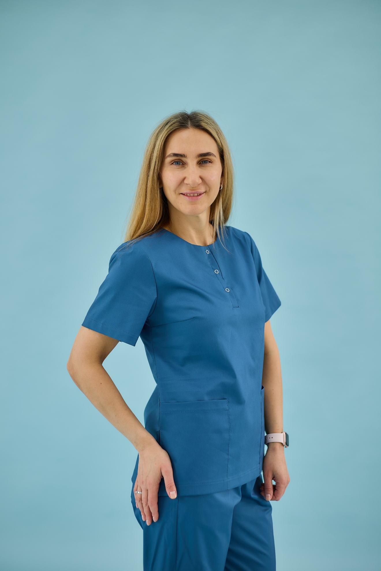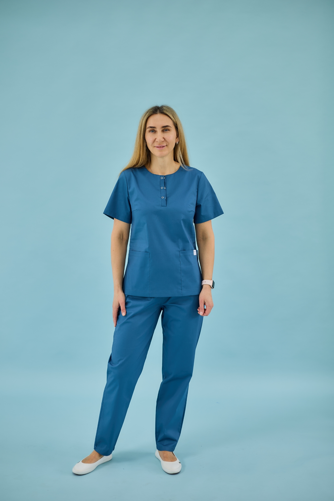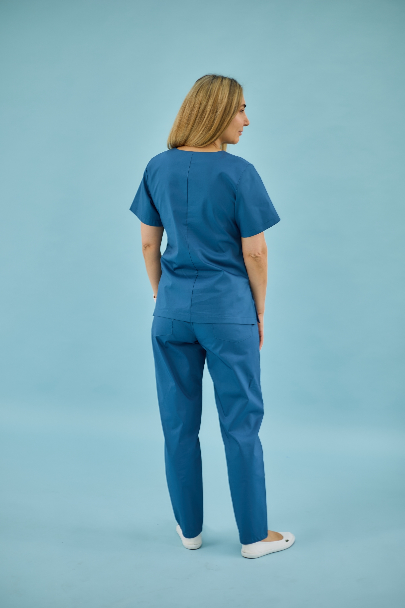 Медичний топ злегка приталеного фасону , має дві місткі кишені. Виконаний із тканини стрейч-котон. Склад тканини: 60% бавовна/3% спандекс/37% поліестер (тягнеться) . Щільність: 140 г/м². По боковому шві є розрізи. Довжина по спинці 65см. Кольори: білий, чорний, небо, сіро-м'ятний, пастельно-блакитний, океанічний.