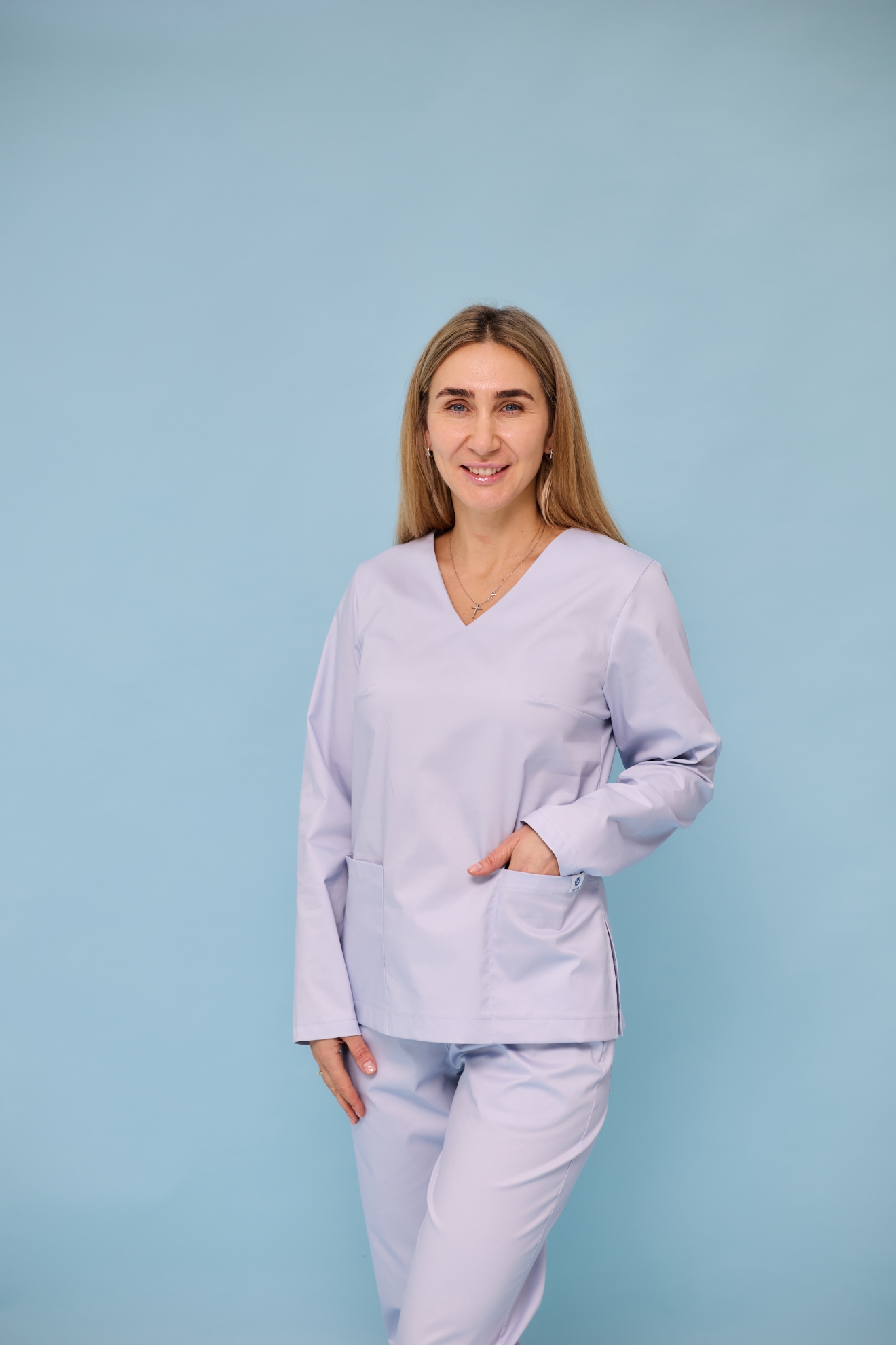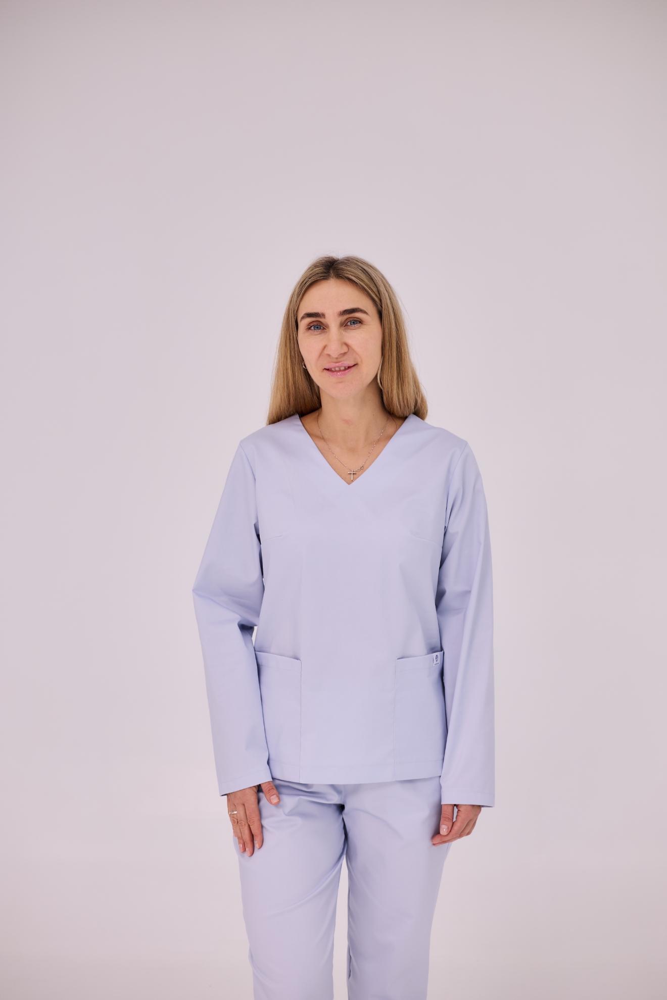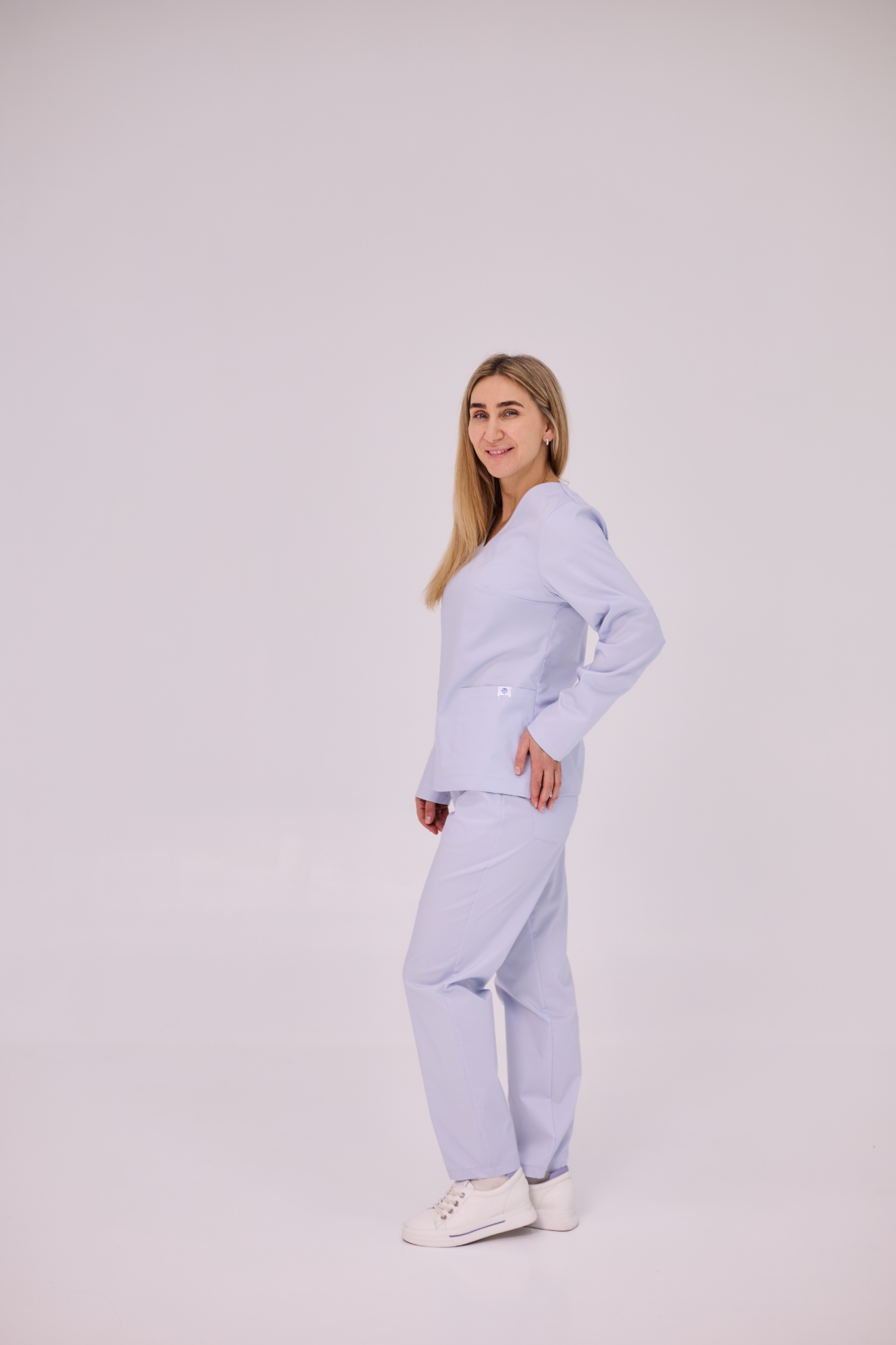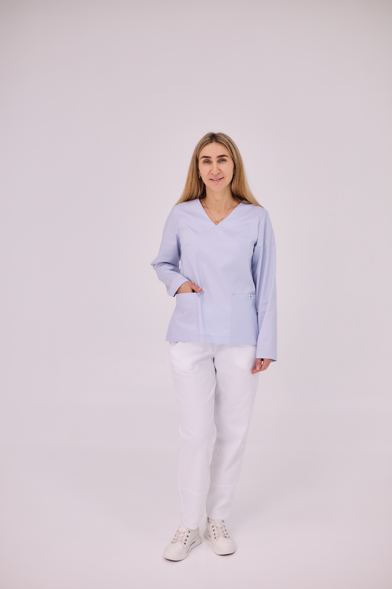 Медичний топ вільного крою , має дві місткі кишені. Виконаний із тканини стрейч-котон. Склад тканини: 60% бавовна/3% спандекс/37% поліестер (тягнеться) . Щільність: 165 г/м². По боковому шві є розрізи. Довжина по спинці 65см. Кольори: океанічний, пастельно-блакитний.