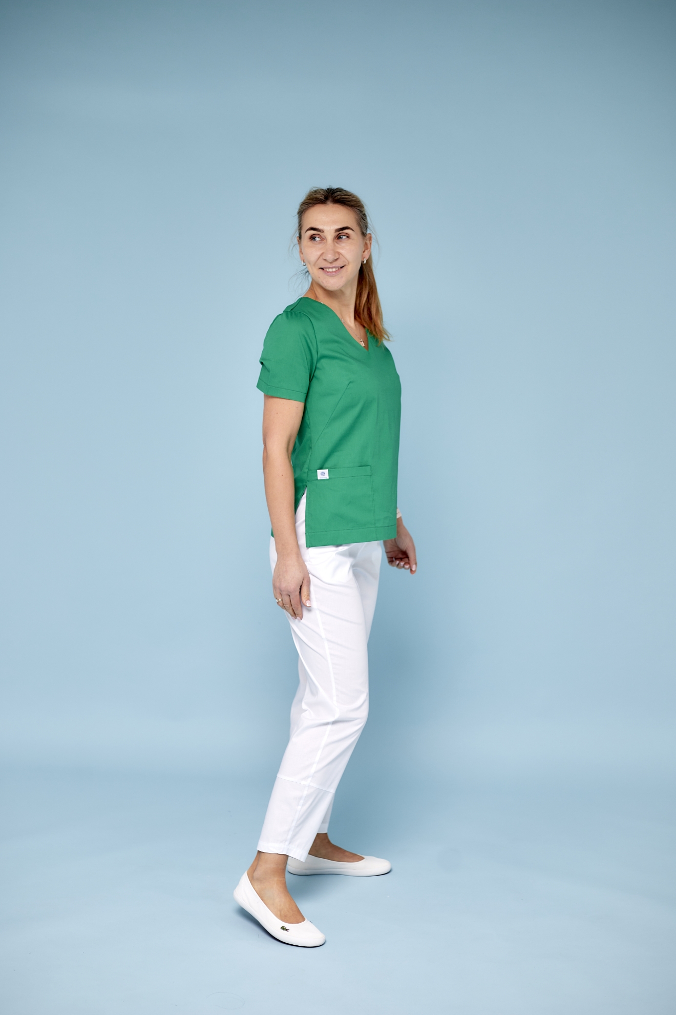 Літні, невагомі медичні штани вільного крою. По внутрішньому шві 73см. Виконані із попліну. Склад тканини: 97% бавовна/3% спандекс (тягнеться) . Щільність: 110 г/м². Пояс на резинці, висока посадка, дві вмісткі кишені, знизу штанина має широкий манжет. Кольори: білий, чорний, мокко, жовтий, малина ( тон 1), малина (тон 2), трава (тон 1), трава (тон 2), небо (тон 1), небо (тон 2).